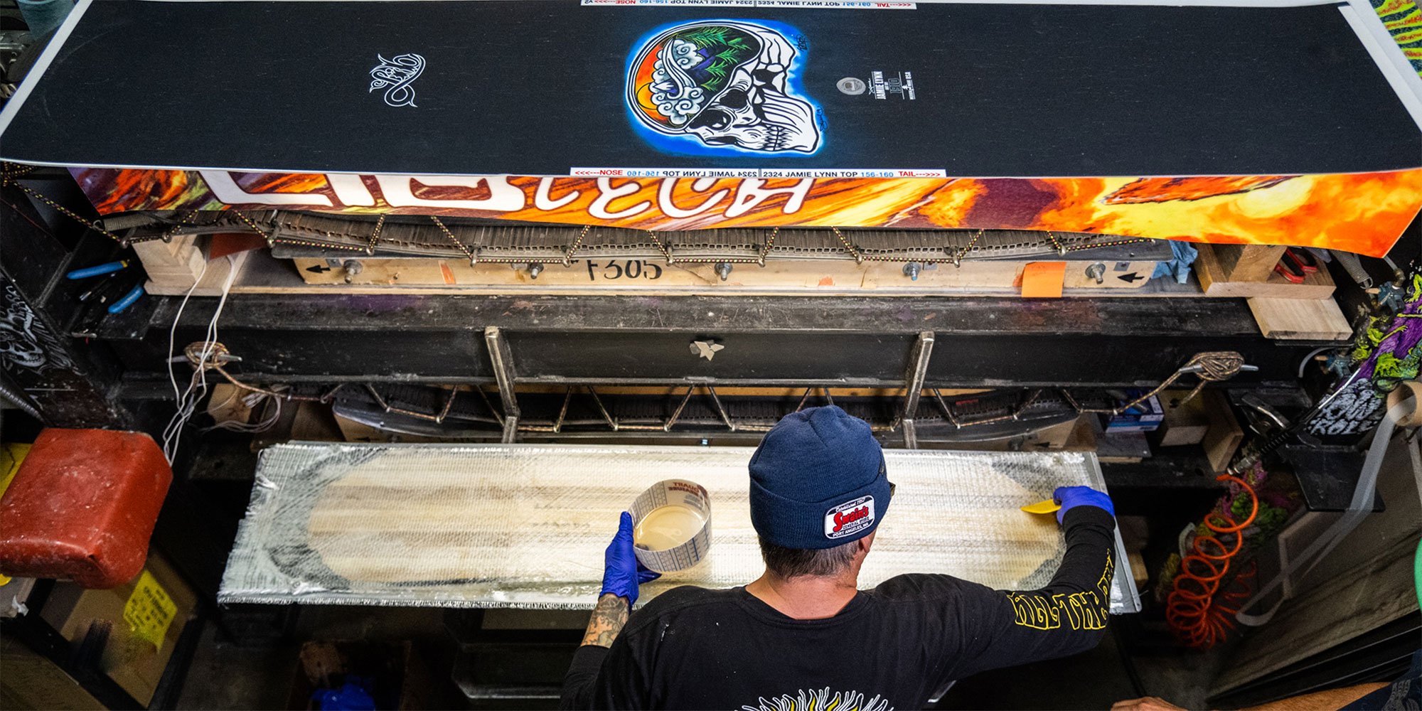 We are stoked to work with Jamie and Schoph’s collaborative art project / brand 1910 for this year’s Jamie Lynn collection! Two unique creative powerhouses with distinct styles that have found harmony together; Jamie and Schoph’s artistic styles and the imagery they choose flow together like a guitar a motor cycle and the open road. Check out more 1910 at here. Our vibrant, zero hazardous waste, eco-sublimation graphics process brings their art to life on a board like only Lib Tech can!